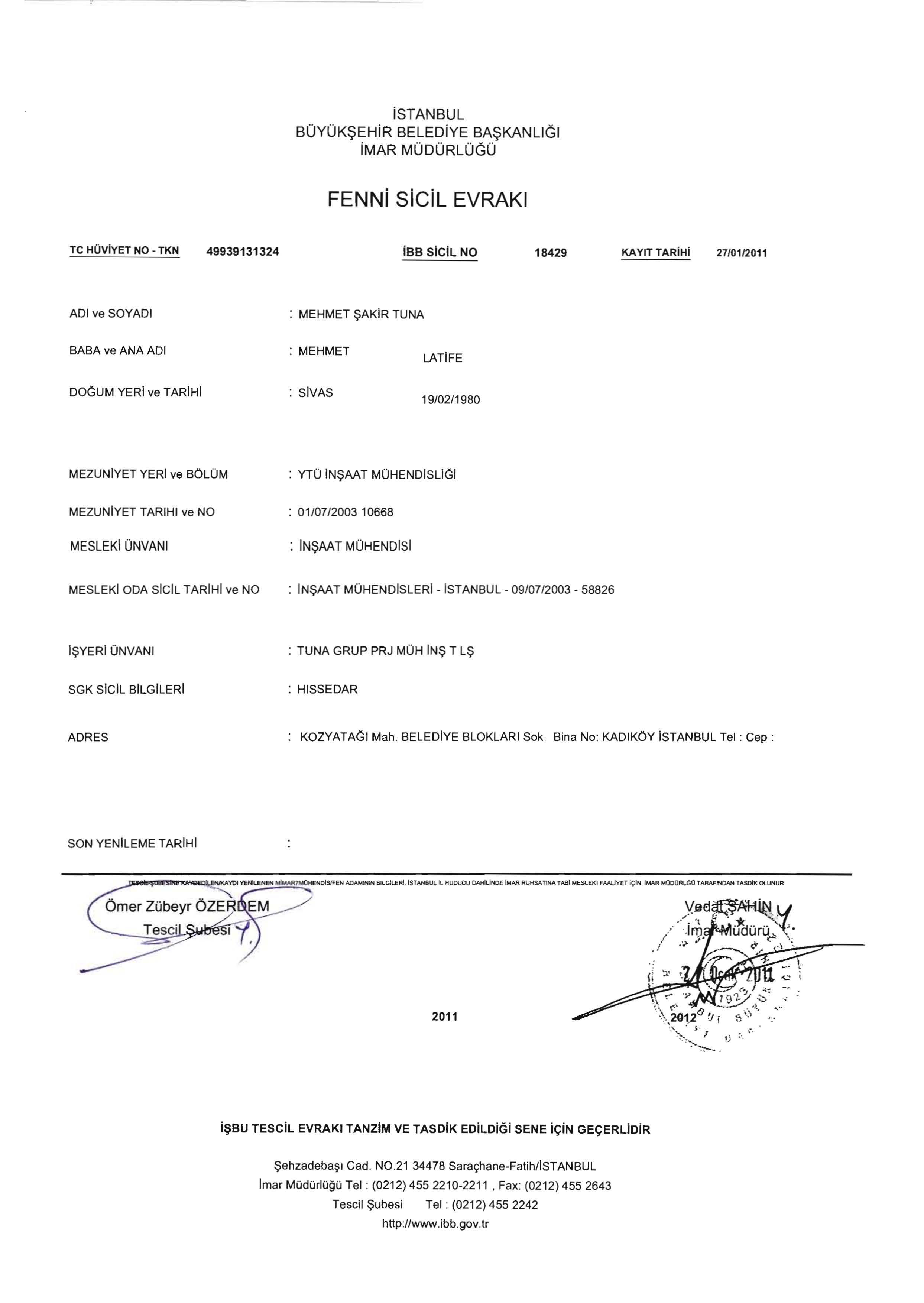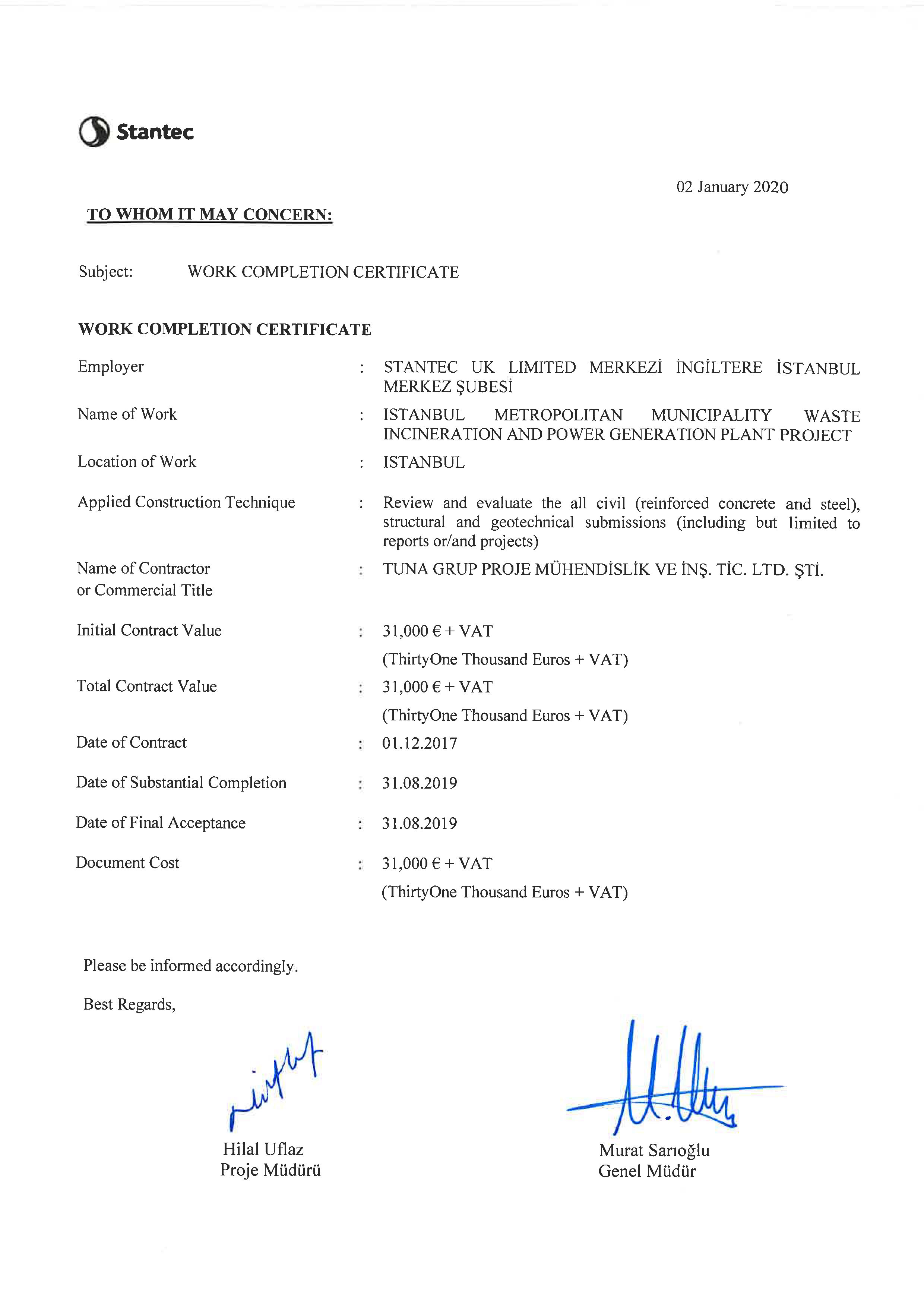 Istanbul Metropolitan Municipality Waste Incineration and Power Generation Plant Project Work Completion Certificate