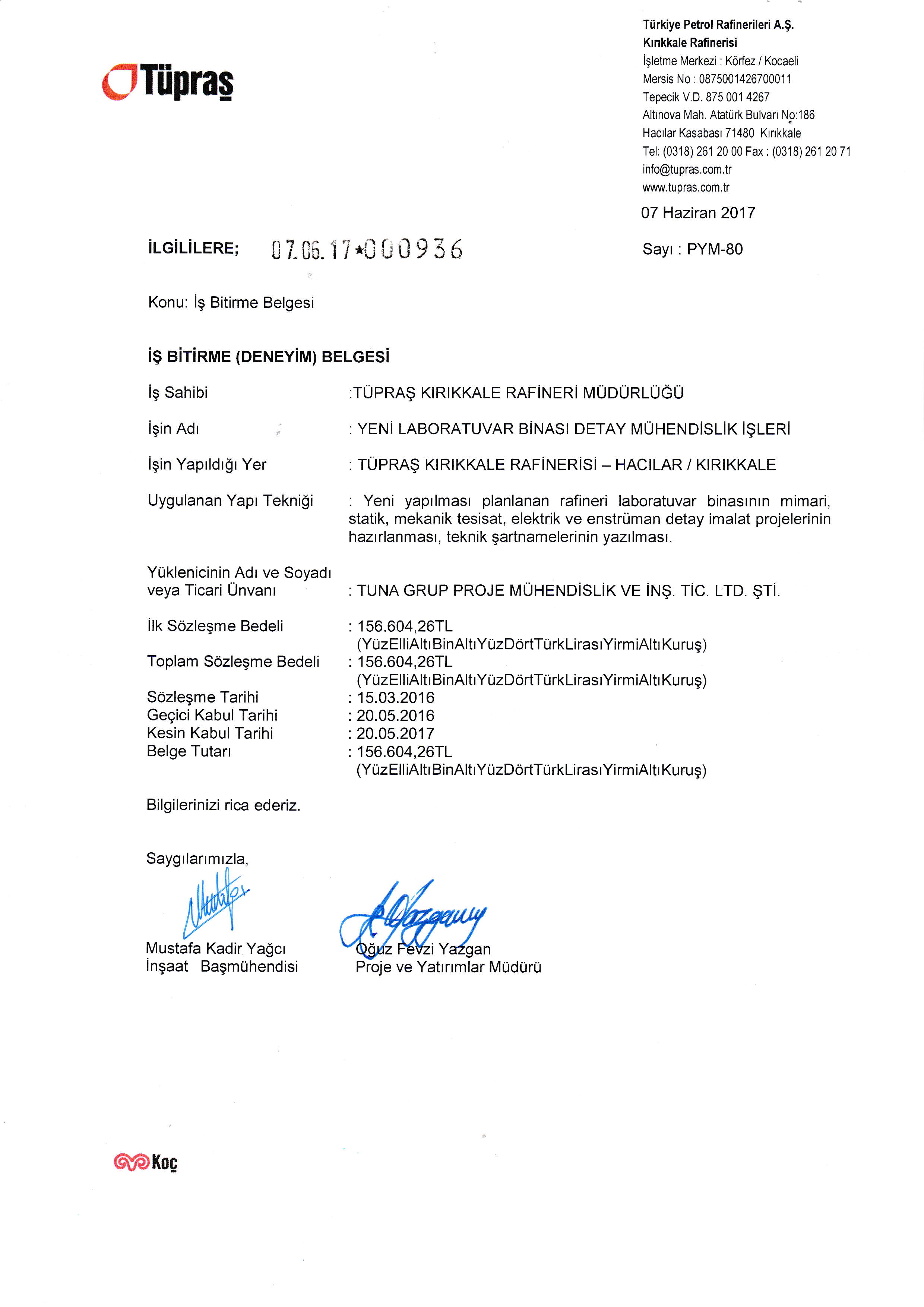 Tüpraş Kırıkkale Refinery New Laboratory Building Detailed Engineering Projects Work Completion Certificate